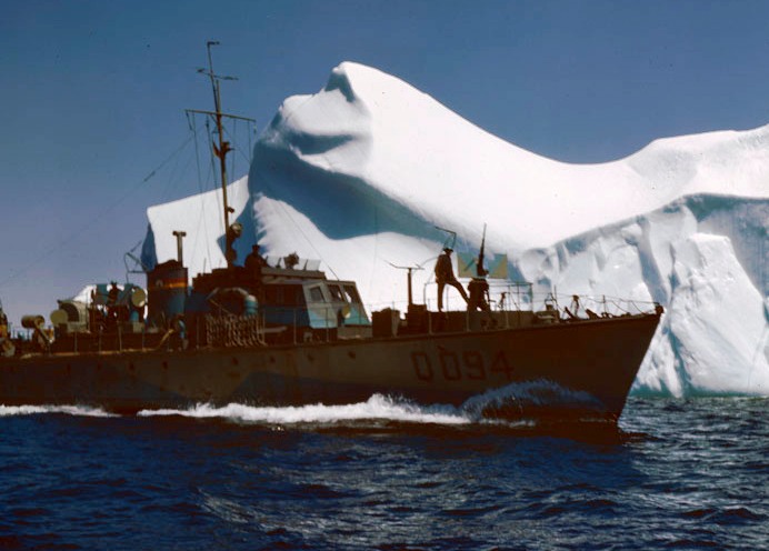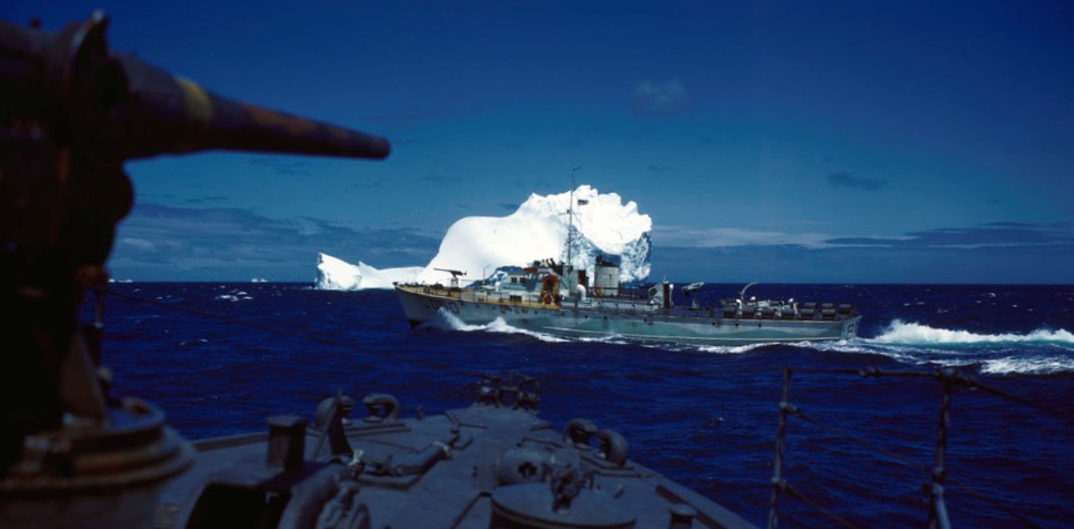 HMCS ML Q050 sails past an iceberg, 1 Aug 1945.