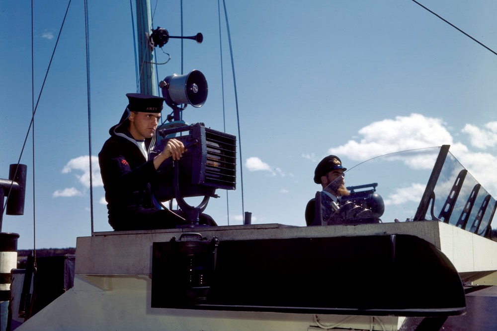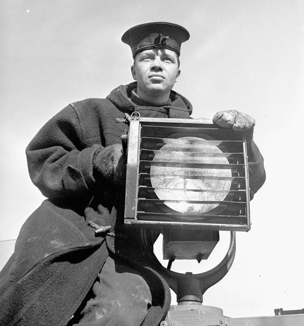 Fairmile Motor Launch, with an RCN Rating using a Signal lamp, 1943.