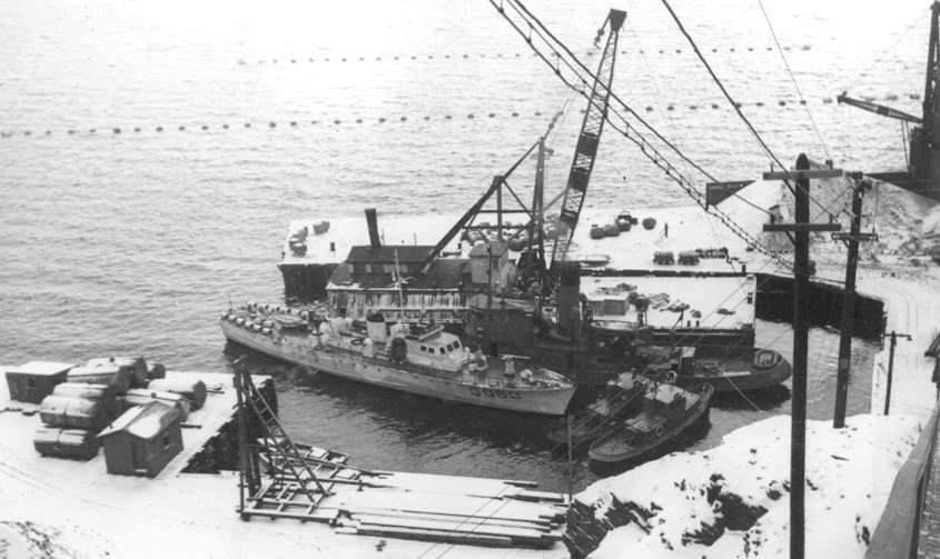ML Q060 at the Wabana Iron Ore Mines ore loading pier, Bell Island, Newfoundland and Labrador, c944-1945.