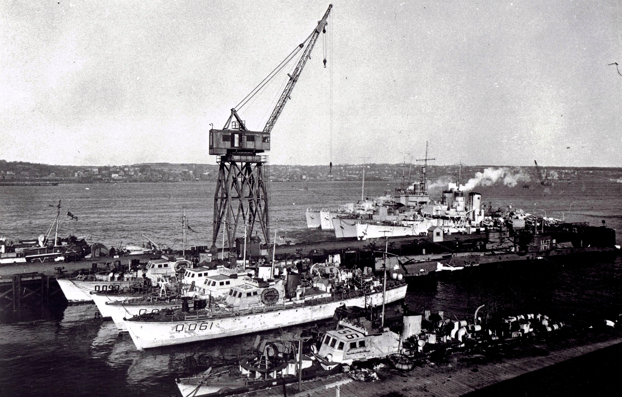 Fairmiles Q093 (76th Fl), Q061 (72nd Fl), Q056 (71st Fl) and sub HMS Seawolf N47 and other ships at Halifax, c 1944-1945.