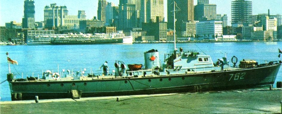 ML Q062, as HMCS Wolf 762 at Windsor, Ontario, with Detroit, Michigan in the background, ca. 1953. HMCS Wolf was a tender to HMCS Hunter.