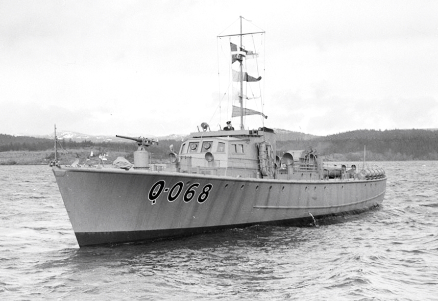 HMCS Q-068, a Fairmile Type B Motor Launch, profile view.