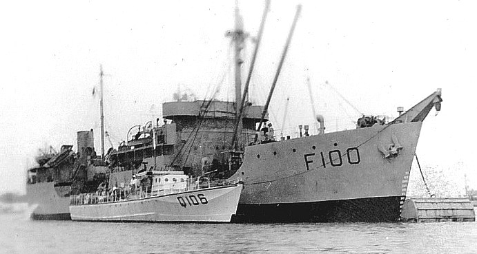 HMCS Provider F100 with Fairmile Q106 alongside.