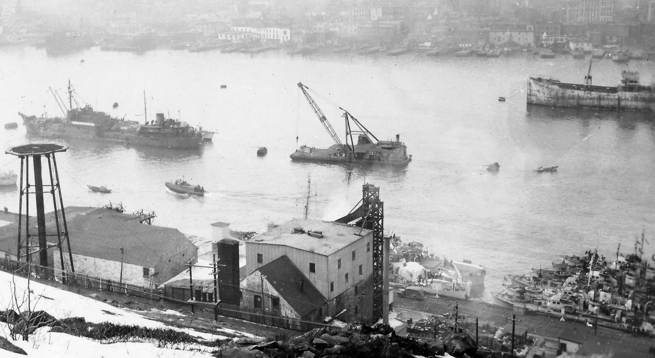 HMCS Preserver F94 secured at the trot buoys, St. John’s, Newfoundland. The Fairmiles of the 77th Motor Launch Flotilla are nested at the jetty