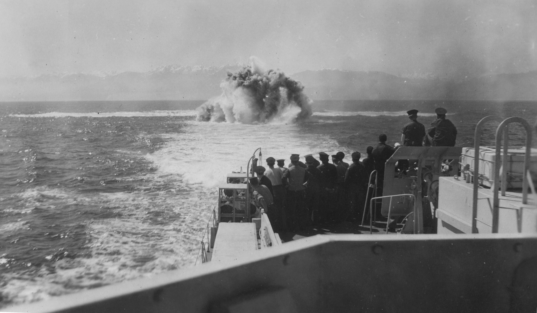 HMCS Orkney (K448) River class Frigate, depth charge, training on the West Coast of Canada ca May 1944.