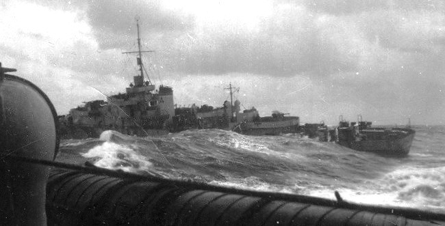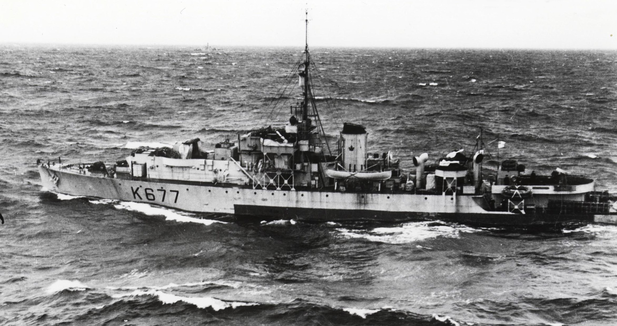 HMCS Sea Cliff (K344) River Class Frigate in rough seas.