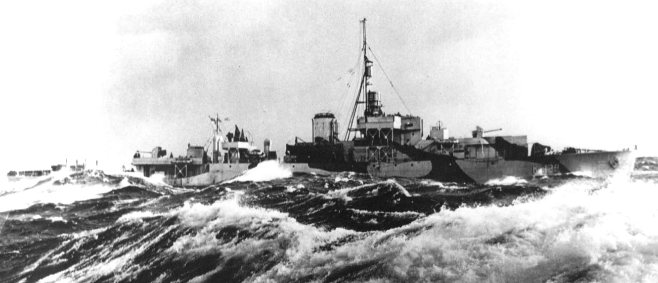 HMCS Swansea (K328) River class Frigate, in rough seas off Bermuda, Jan 1944.
