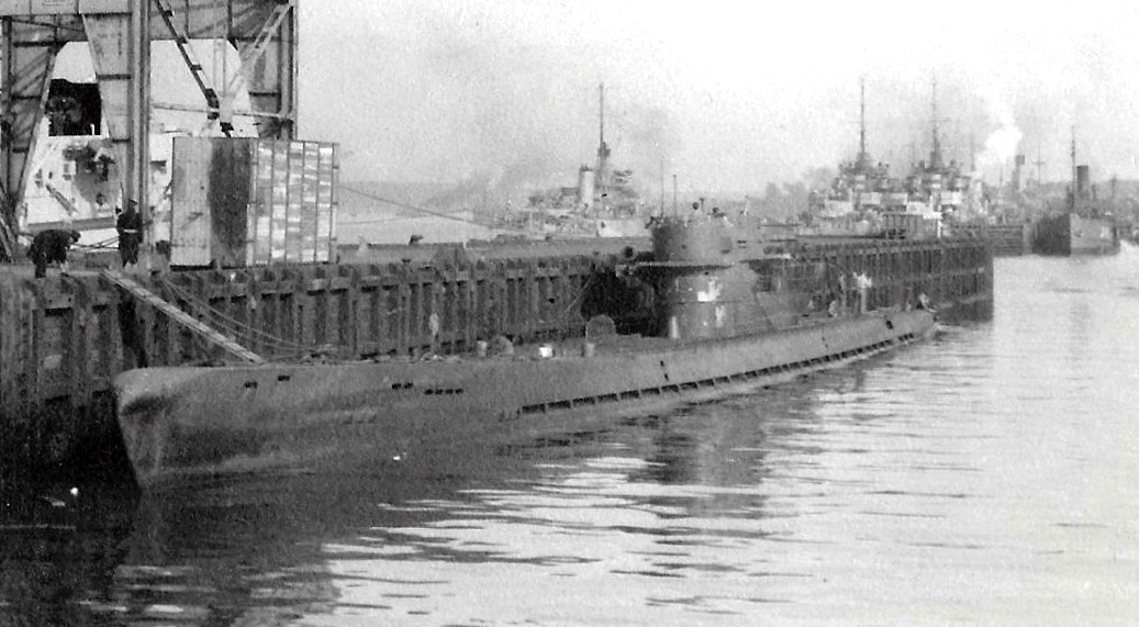HMCS Thetford Mines (K458), arrived in Lough Foyle escorting eight surrendered U-Boats, including these two, on 11 May 1945.