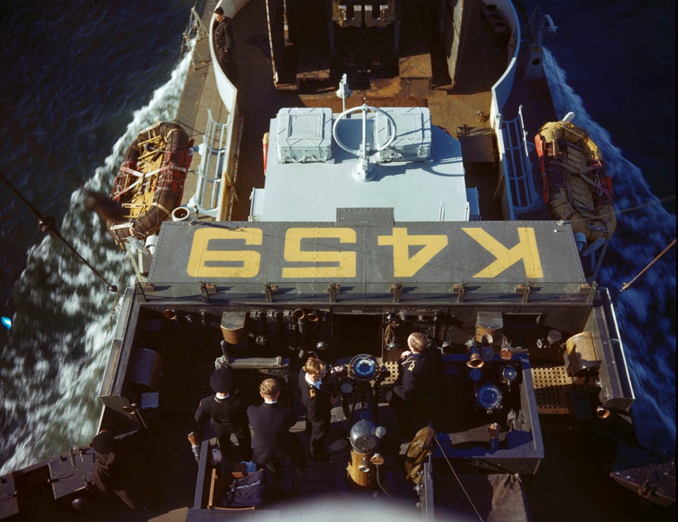 HMCS Thetford Mines (K459) River class Frigate, escorting surrendered U-boats, May 1945.