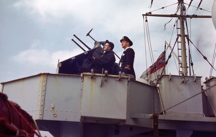 HMCS Thetford Mines (K459) River class Frigate, twin 20-mm Oerlikon AA Guns on a powered mount, ca 1945.