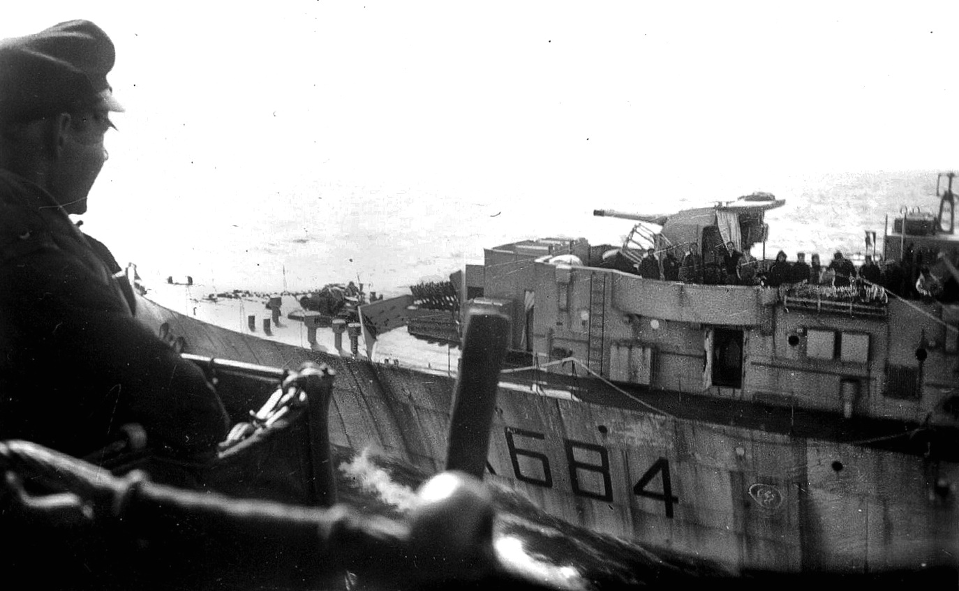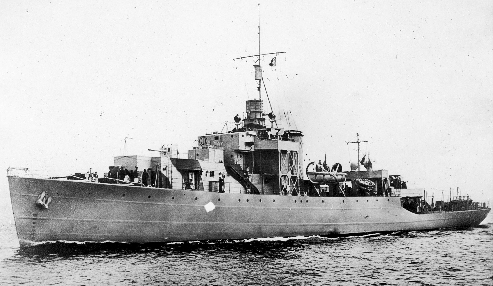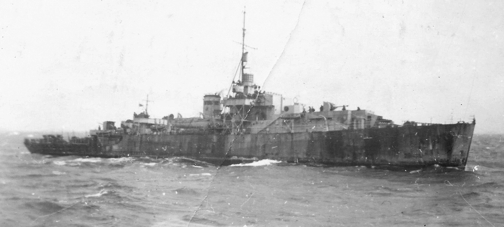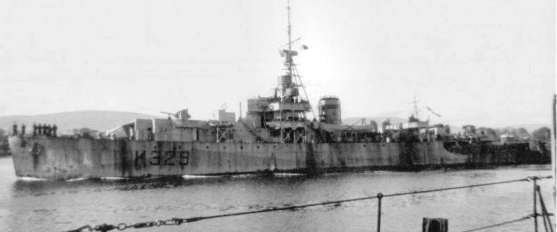 HMCS Valleyfield (K329) River class Frigate. Built at Quebec City, she was commissioned there 7 Dec 1943. She arrived at Halifax on 20 Dec 1943 and commenced working up in St. Margaret’s Bay, completing the process in Bermuda. She left Halifax at the end of Feb 1944, to join EG C-1 and sailed for the UK with convoy SC.154, but was detached to Horta en route, escorting a tug and its tow, the rescue ship Dundee. Her next assignment was to escort the damaged HMCS Mulgrave, in tow from Horta for the Clyde. The three left the Azores on 14 Mar 1944 and joined convoy SL.151 (from Sierra Leone) three days later. HMCS Valleyfield made one return trip to Canada, and on her next trip left Londonderry on 27 Apr 1944 with convoy ON.234. On 7 May 1944, HMCS Valleyfield was sunk by a single acoustic torpedo by U-548 (Kptlt Eberhard Zimmermann) 0435hrs, 50 miles SE of Cape Race, 46-03N 52-24W. At the time, HMCS Valleyfield was part of escort group C1, performing a search for the U-boat. HMCS Valleyfield sank so quickly that other ships in the group did not immediately realize what had happened. A combination of the ship’s quick sinking, the delay in rescue efforts, and the cold water resulted in only 38 survivors with 125 crew members including LCdr English lost. Survivors were rescued by HMCS Giffard (K402). She was the only RCN ship of her class to be lost.