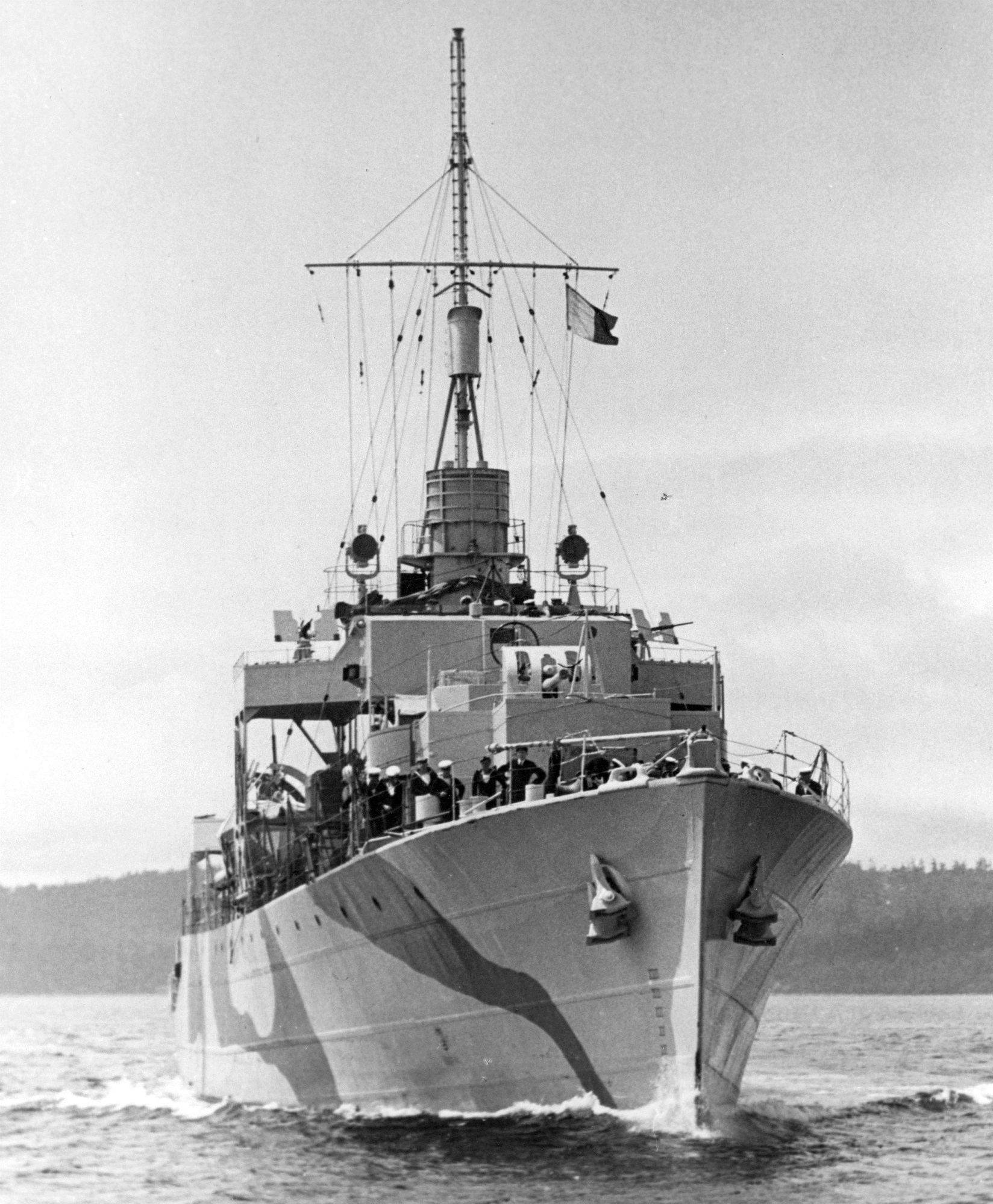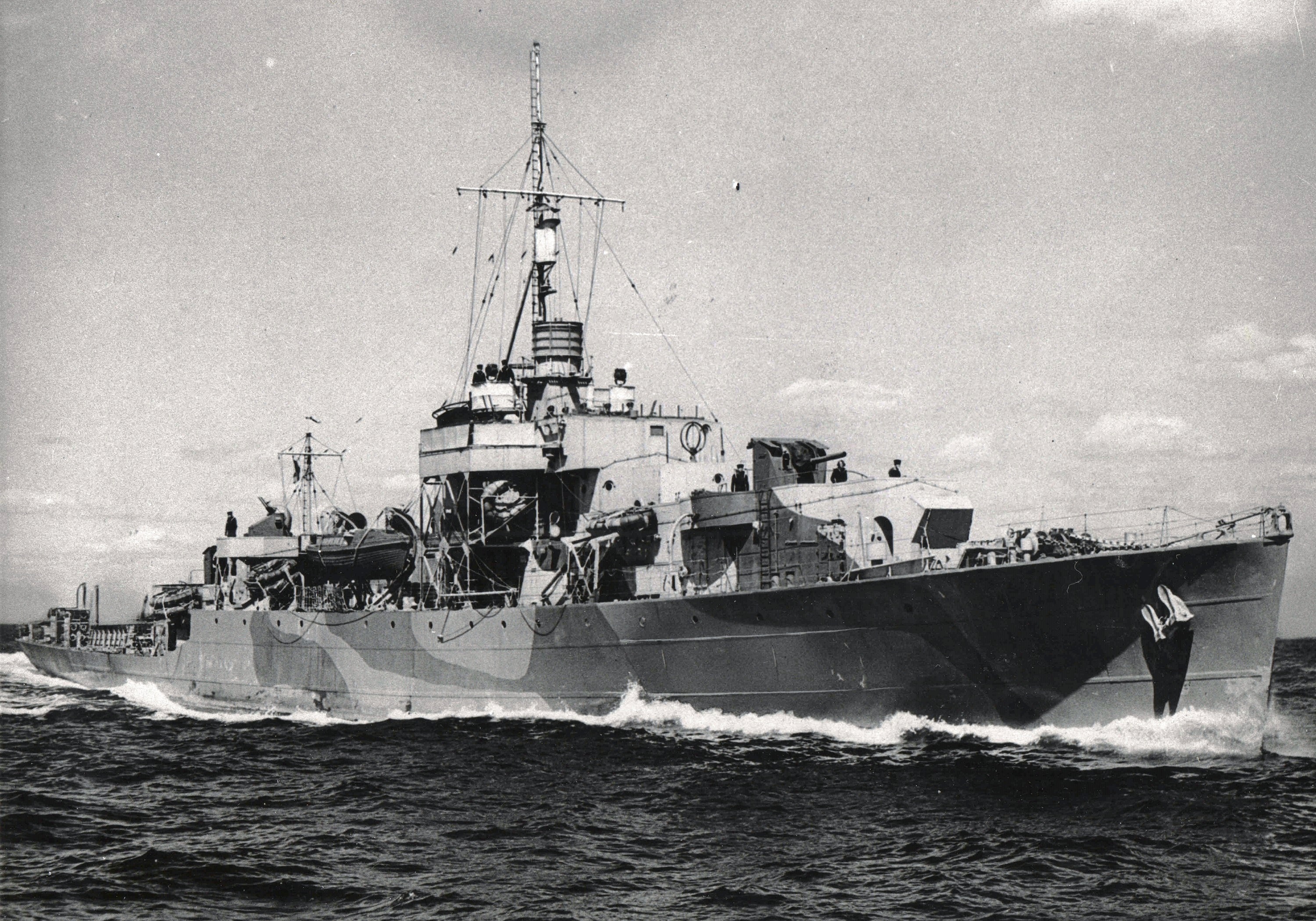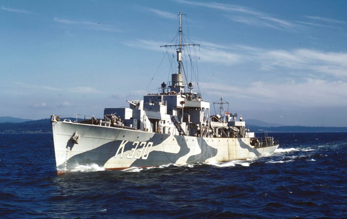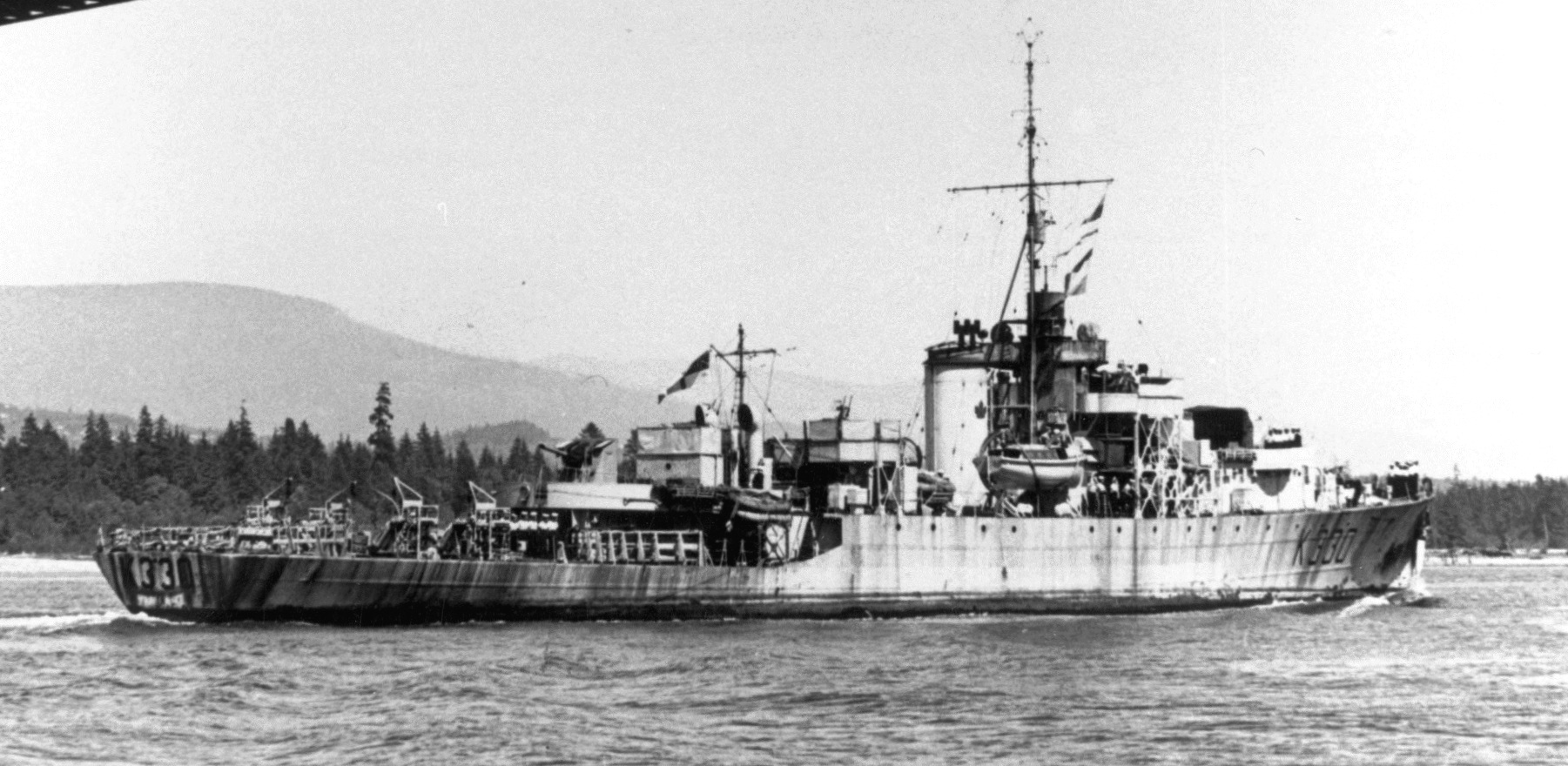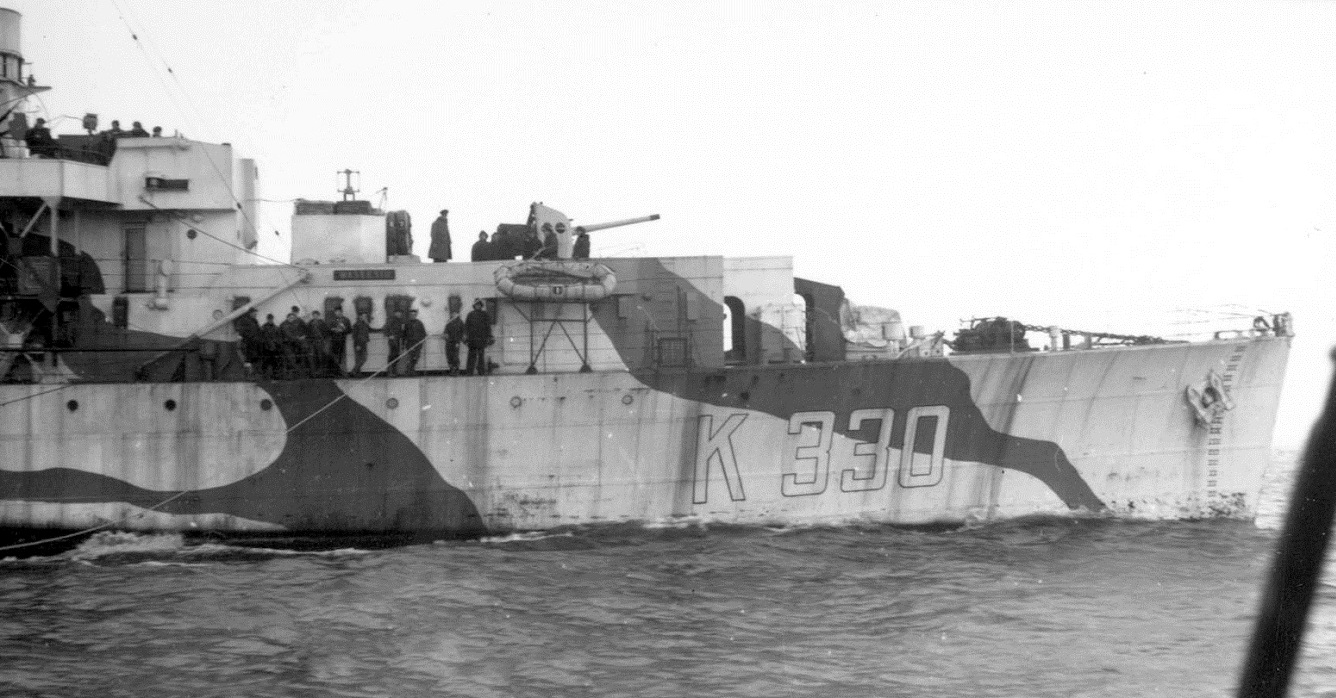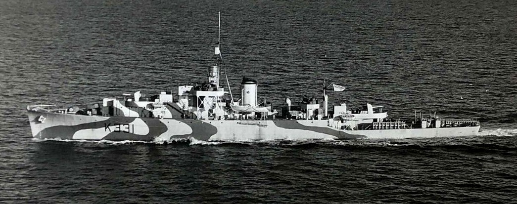 HMCS Waskesiu (K330) River class Frigate, 1944. The first frigate completed on the west coast, HMCS Waskesiu was commissioned at Victoria on 16 Jun 1943, and left for Halifax on 8 Jul. She worked up in Bermuda the following month, returning to Halifax on 11 Sep 1943, and late in Oct 1943 left for Londonderry to join EG 5, re-numbered EG 6 on 21 Nov 1943. HMCS Waskesiu served chiefly in UK waters, but early in 1944 supported Gibraltar and Sierra Leone convoys. On 24 Feb 1944, while escort to SC.153, she sank U-257, and in Apr 1944 made a trip to North Russia to bring back convoy RA.59. On 28 Apr 1944, HMCS Waskesiu, HMCS Grou K518, HMCS Outremont K322 and HMCS Cape Breton K350 departed Kola Inlet with Convoy RA.59; arriving at Loch Ewe on 6 May 1944. She was present on D-Day. On 14 Sep 1944 she left ‘Derry with ONF.253 for Canada, and soon after arriving began an extensive refit at Shelburne. On its completion in Mar 1945, she proceeded to Bermuda to work up, following which she sailed for Londonderry via Horta. She left ‘Derry for Canada late in May 1945, proceeding to Esquimalt in Jun 1945 to commence tropicalization refit, but work suspended in Aug 1945 and she was paid off into reserve on 29 Jan 1946. She was sold to the Indian government in 1947 for conversion to a pilot vessel, and re-named Hooghly in 1950.
