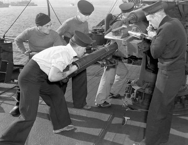 DEMS (Defensively Equipped Merchant Ships) personnel taking part in gun drill aboard an unidentified merchant ship, Halifax, Nova Scotia, Canada, 29 November 1942.
