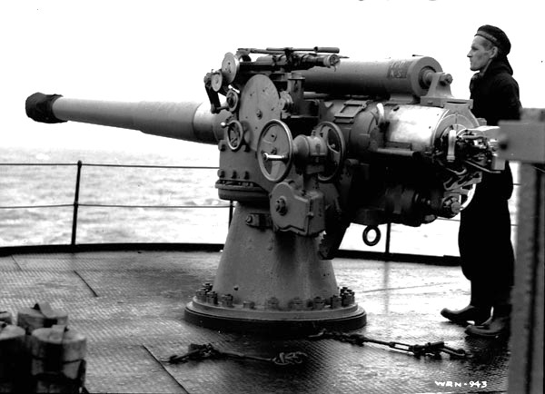 BL 4-inch Mk VII low-angle gun on a DEMS in 1943. This was an obsolete First World War gun typical of Second World War DEMS armament.  Canada placed guns on 713 ships,