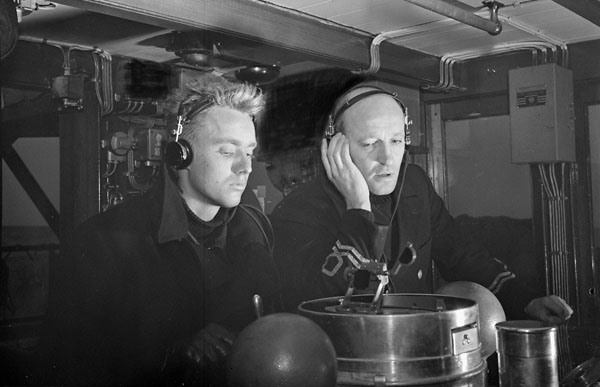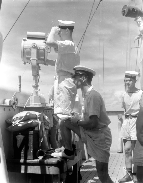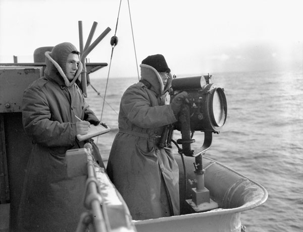 Signallersaboard HMCS Prince Henry reading a signal from Circassia off Bermuda, October 1941.