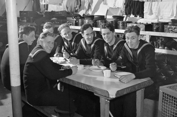 Crewmen of the minesweeper HMCS Stratford having a meal in their mess deck, St. John’s, Newfoundland, November 1943.