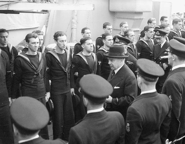 The Right Honorable W.L. Mackenzie King, Prime Minister of Canada, inspecting the Ship’s Company of HMCS Assiniboine, 19 Oct 1940.