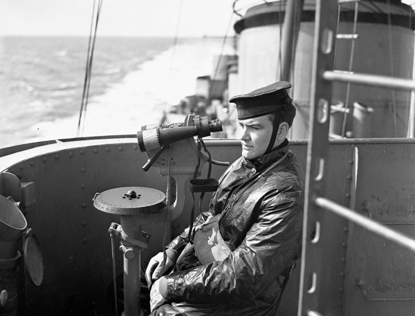 RCN sailor on watch aboard HMCS Iroquois at sea, 1943.