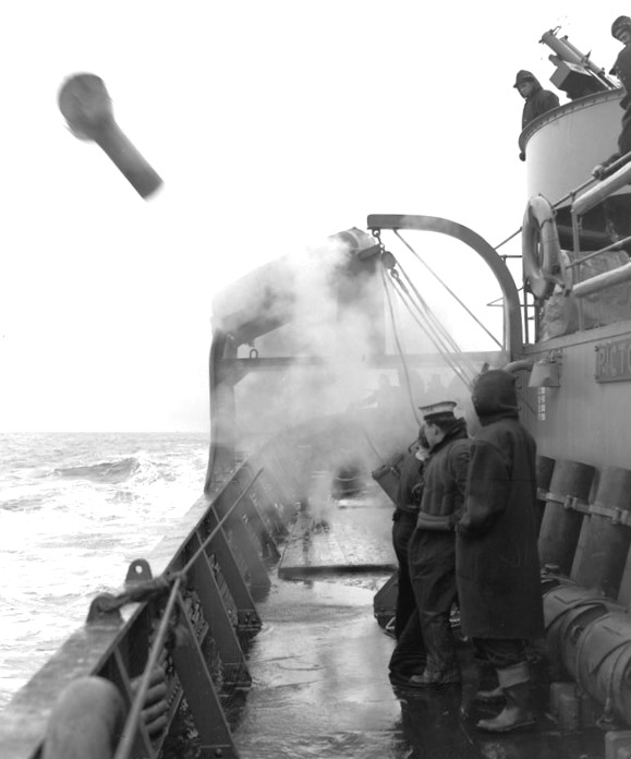 Firing of a depth charge from the corvette HMCS Pictou at sea, March 1942.