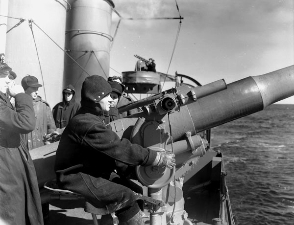 A Canadian machine gun crew aboard HMT Empress of Canada, which was taking part in Operation GAUNTLET, the Spitsbergen raid, en route to Spitsbergen, ca. 19-24 August 1941.