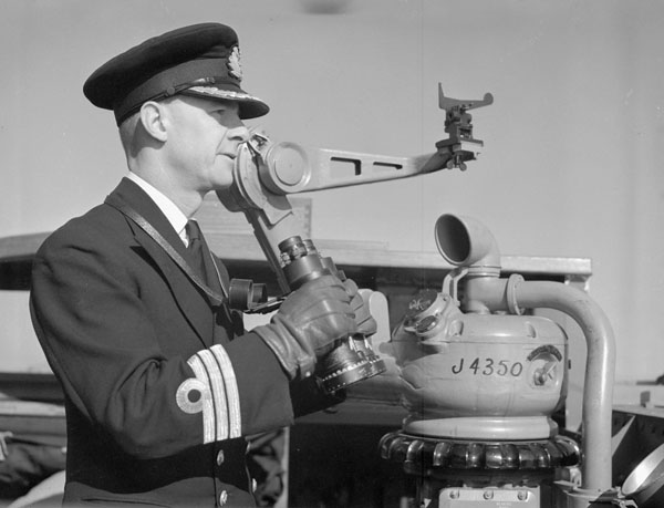 Lieutenant John H. Stubbs, who is using a sextant, on the bridge of the destroyer HMCS Assiniboine off Halifax, Nova Scotia, September 1940.