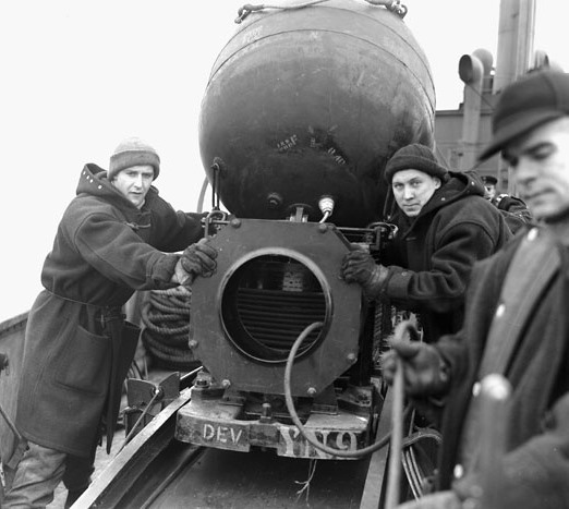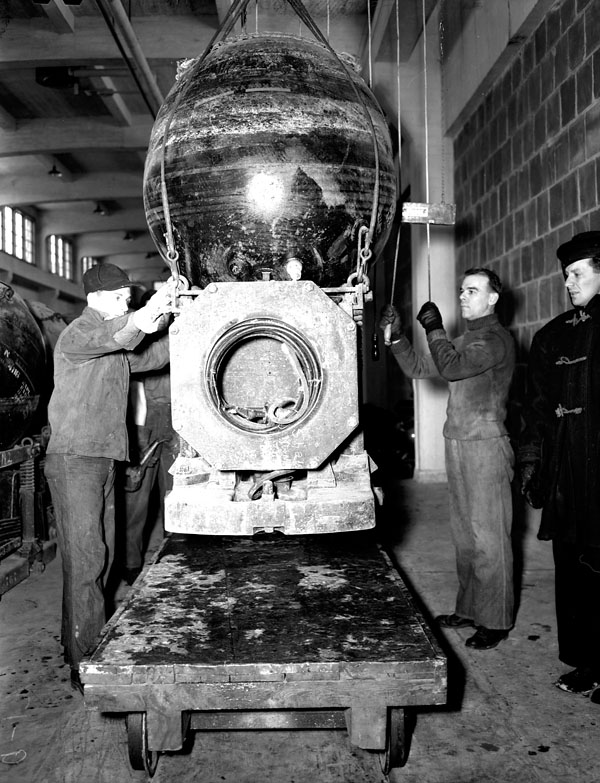 Personnel handling a damaged mine and its cradle, Naval Armament Depot, Dartmouth, Nova Scotia, Canada, 16 March 1943.