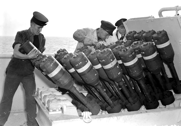 Personnel preparing to fire depth charges as the destroyer HMCS Saguenay attacks a submarine contact at sea, 30 October 1941.