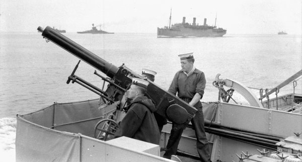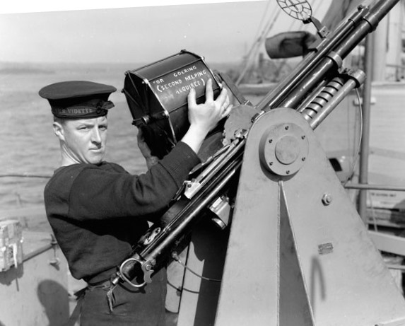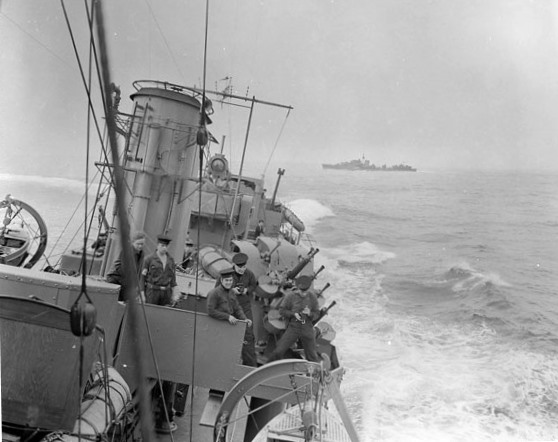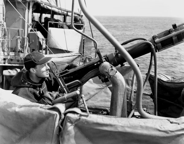 HMCS Assiniboine (I18) quad 0.5 Vickers machine gun, crew with a view of an unidentified Royal Navy destroyer taking over the escort of Convoy HX180 from its Royal Canadian Navy escort, 19 March 1942. The HX Fast Convoy Rendezvous Point was just south of Iceland, where the RCN Navy Escorts handed off to the Royal Navy Escorts. HX 180 Sailing Orders show 35 ships arrived at Liverpool on 27 March 1942. No losses were noted. At 2 days out this may be the first handoff from the coastal patrol zone escort to the transit escort. (Mike Cadeau)