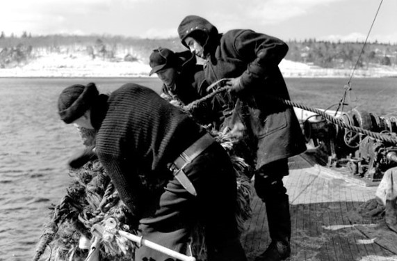 Ratings holding up a codfish which was killed by the explosion of depth charges dropped by the Fairmile motor launch ML 052 of the Royal Canadian Navy off Halifax, Nova Scotia, Canada, 17 November 1941.