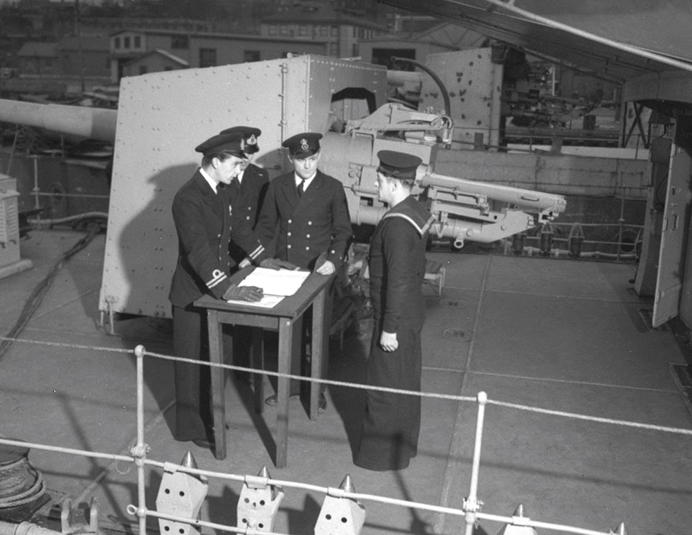Captain’s Requestmen aboard HMCS Assiniboine. Leading Stoker Henri LeClair at left. Officer behind table is Lieutenant J.H. Stubbs, November 1940.