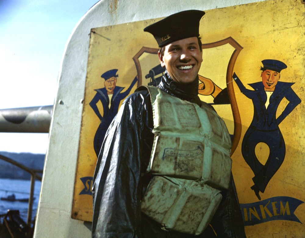 Able Seaman Enio Girardo, rescued from the sea by shipmates, in front of the forward gun – HMCS Edmundston.