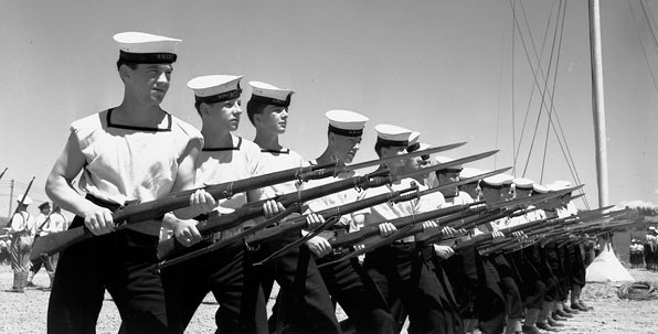 Naval recruits with fixed bayonets, HMCS Cornwallis, Deep Brook, Nova Scotia, June 1943.