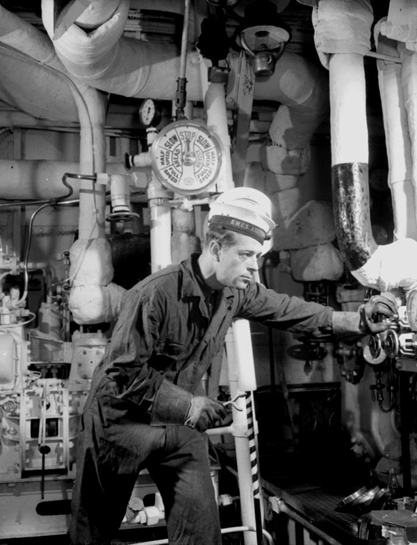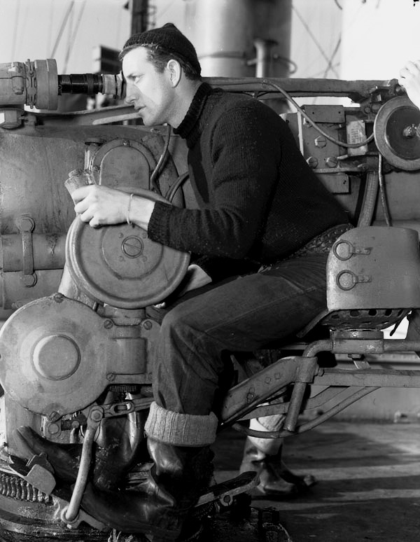 Leading Stoker Henri LeClair in the engine room of HMCS Assiniboine, Halifax, Nova Scotia, November 1940.