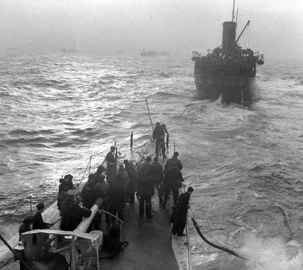 The destroyer HMCS St. Francis, which is escorting a convoy, prepares to take on fuel from a tanker at sea, 7 November 1942.