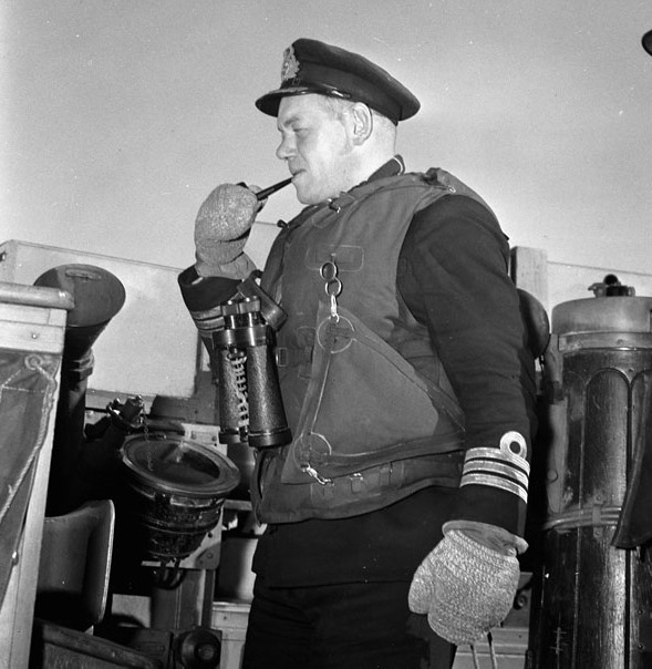 Commander Hugh F. Pullen, Commanding Officer, on the bridge of HMCS Ottawa at sea, 22 November 1943.