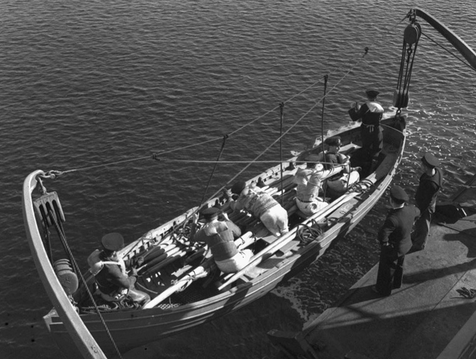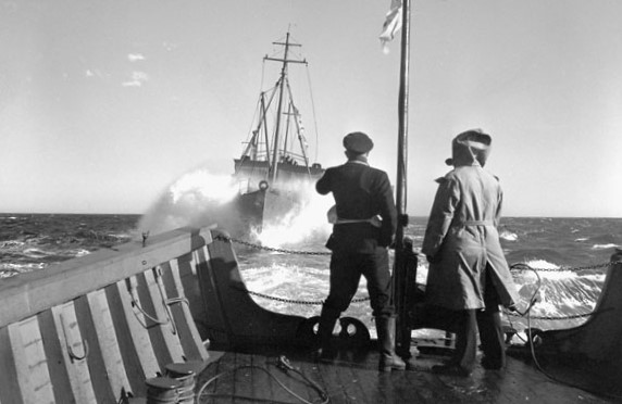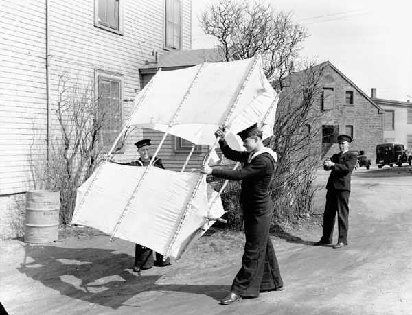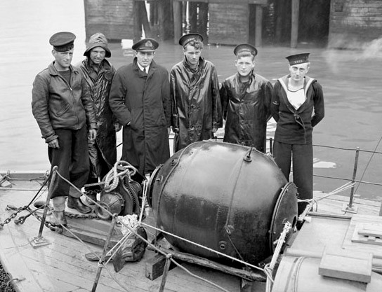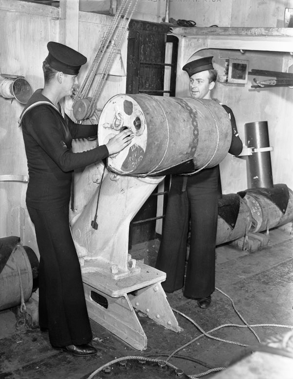 Personnel preparing to launch a paravane minesweeping float from HMCS Alberni off the coast of British Columbia, March 1941. The minesweeper tows two of these paravanes – one to port and one to starboard- with a cutting cable. The cutting cable severs the mine’s anchor cable, the mine then floats to the surface where it is destroyed by gunfire. (Paul O’Reilly)