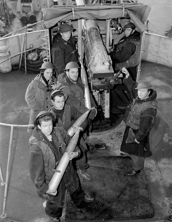 RCN ratings manning a four-inch gun aboard HMCS St. Croix at sea, March 1941.