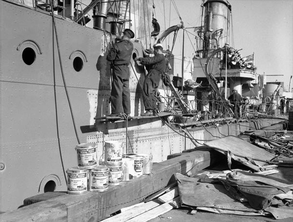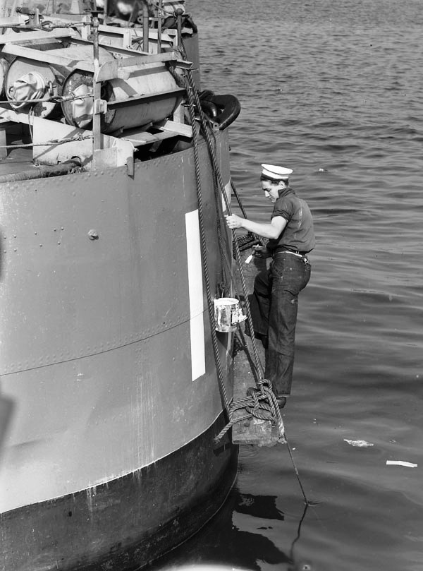 RCN rating painting the pendant number (H00) on the stern of HMCS Restigouche during her refit at Halifax, Nova Scotia, October 1940.