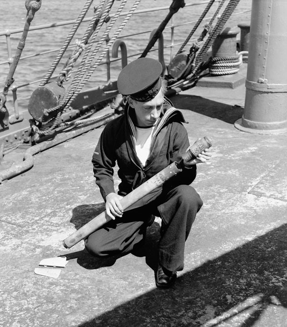 New Entry RCN ratings learning how to rig a collision mat aboard a training ship of the Royal Canadian Navy, Halifax, Nova Scotia, 3 March 1943.