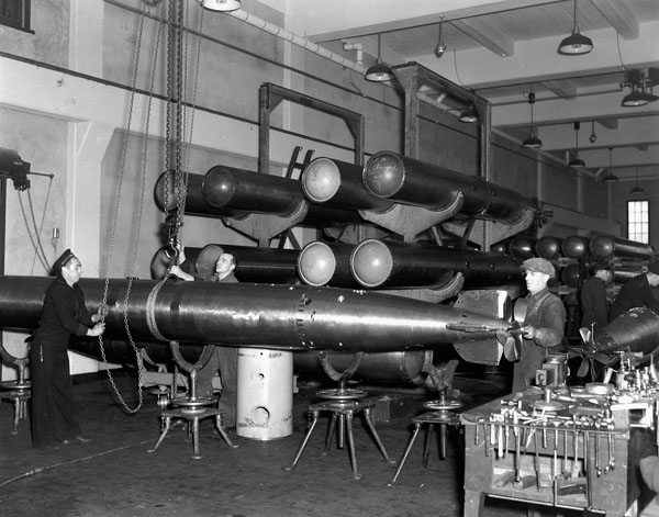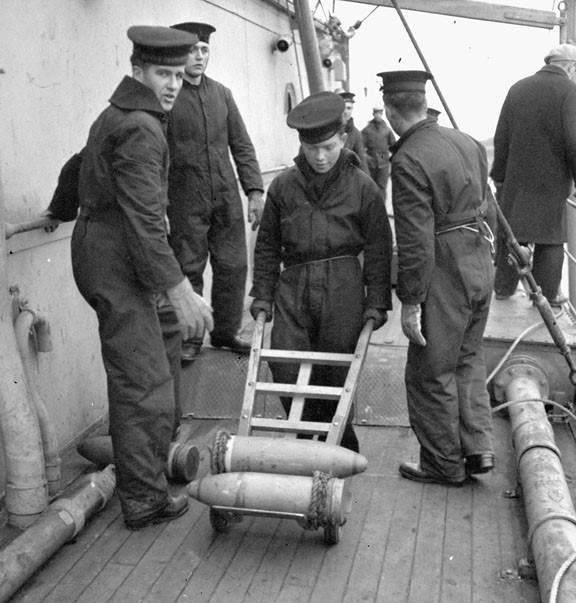 Ratings loading six-inch shells aboard HMCS Prince David, Halifax, Nova Scotia, January 1941.