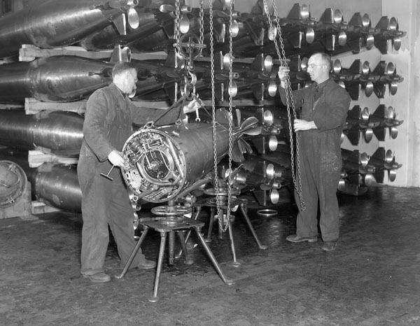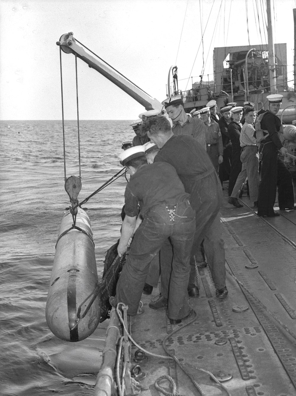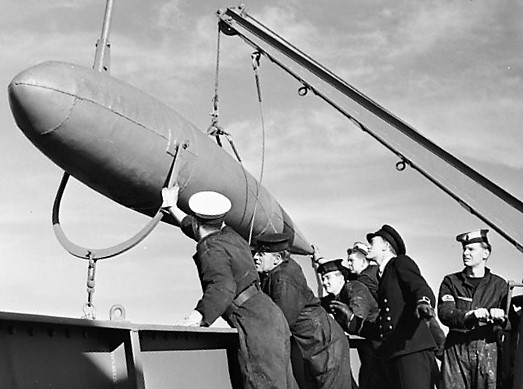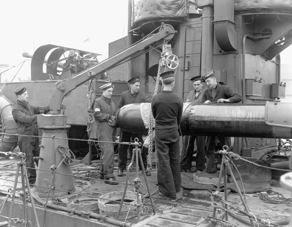 Ratings hoisting practice torpedo aboard HMCS Ottawa, July 1940.