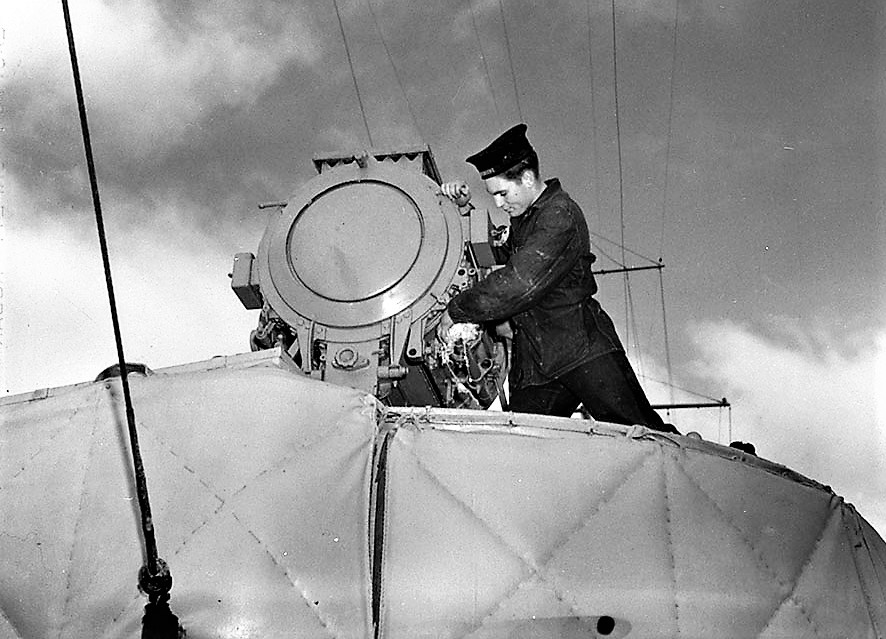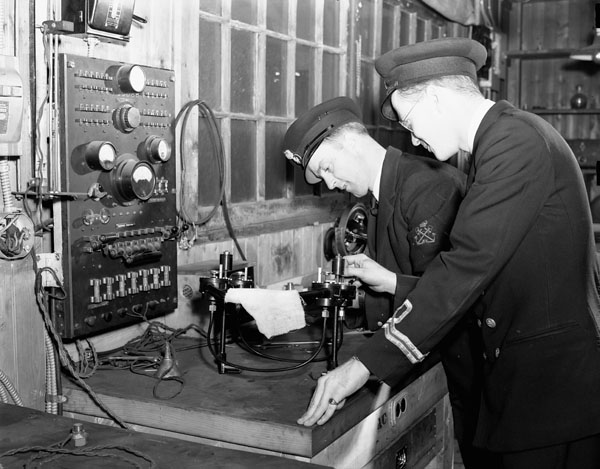 Signalmen Clark and Waters operating a signal projector aboard the destroyer HMCS Assiniboine at sea, 1940.