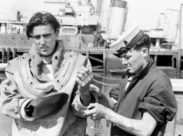 RCN diver putting on his suit, Halifax, Nova Scotia, August 1940.
