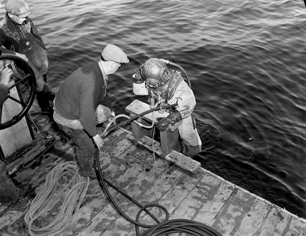 Diver preparing to check that the corvette HMCS Lethbridge is properly seated on the stocks of the marine haulout, Sydney, Nova Scotia, 2 November 1942.