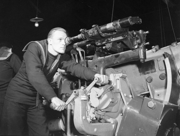 Able Seaman F.E. Brown operating a rangefinder, Royal Canadian Navy Gunnery School, Halifax, Nova Scotia, Canada, 1940.