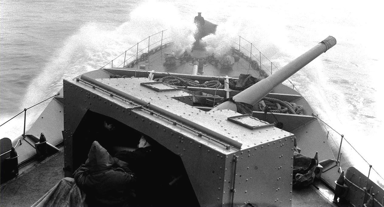 RCN sailors manning a 4-inch gun in the forward “bandstand” on a Flower-class Corvette.