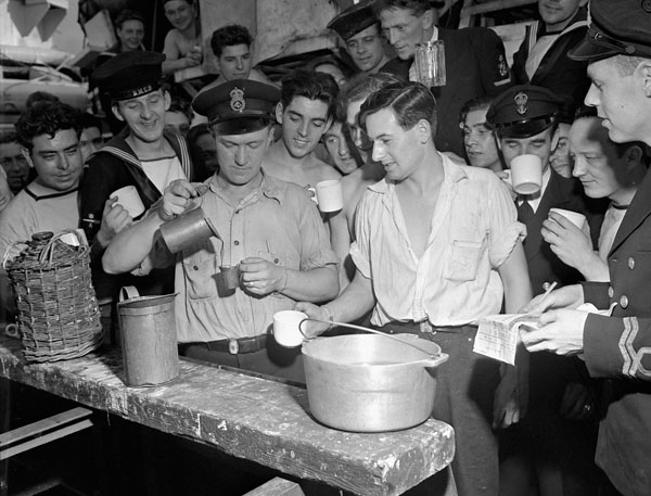 Splicing the mainbrace: distribution of rum ration aboard HMCS Arvida to celebrate the news of the surrender of Italy. St. John’s, Newfoundland, 8 September 1943.