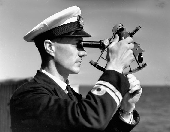 Lieutenant W.E. Harrison, Royal Canadian Naval Volunteer Reserve (RCNVR), using a sextant, Halifax, Nova Scotia, Dec 1943.
