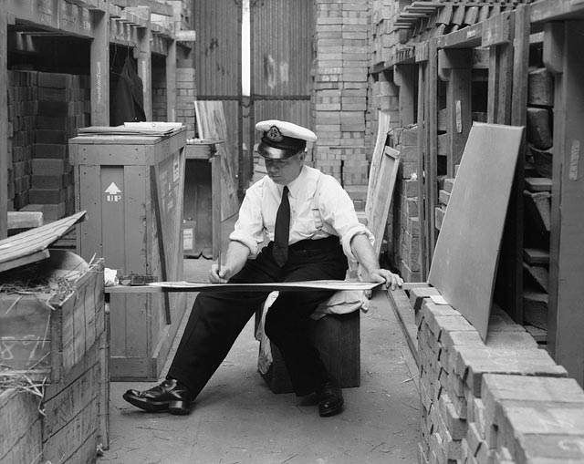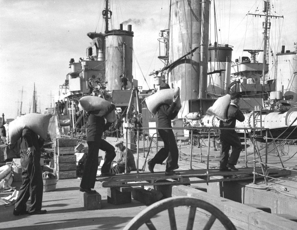 Ratings carrying supplies aboard HMCS Restigouche, 1 July 1940.