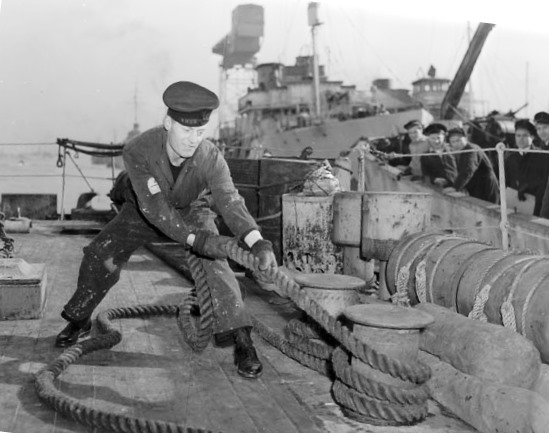 RCN rating tightening a mooring line around a bollard, HMC Dockyard, Halifax, Nova Scotia, 3 March 1943.